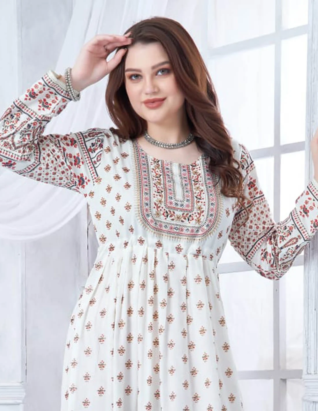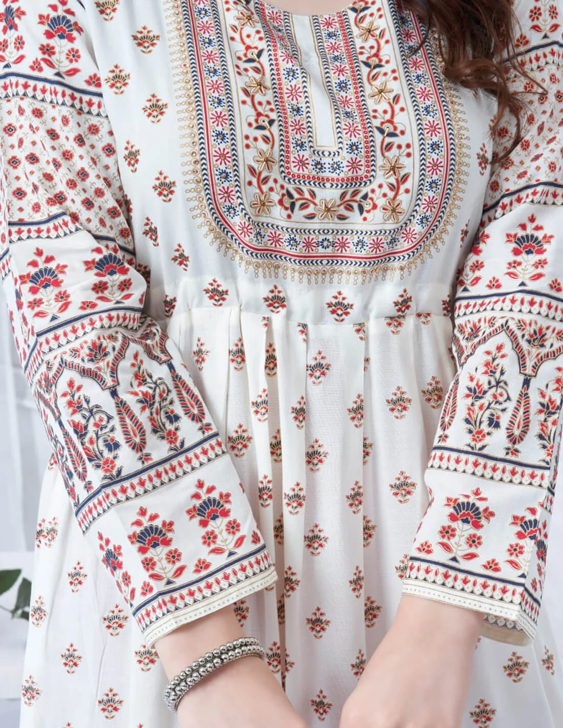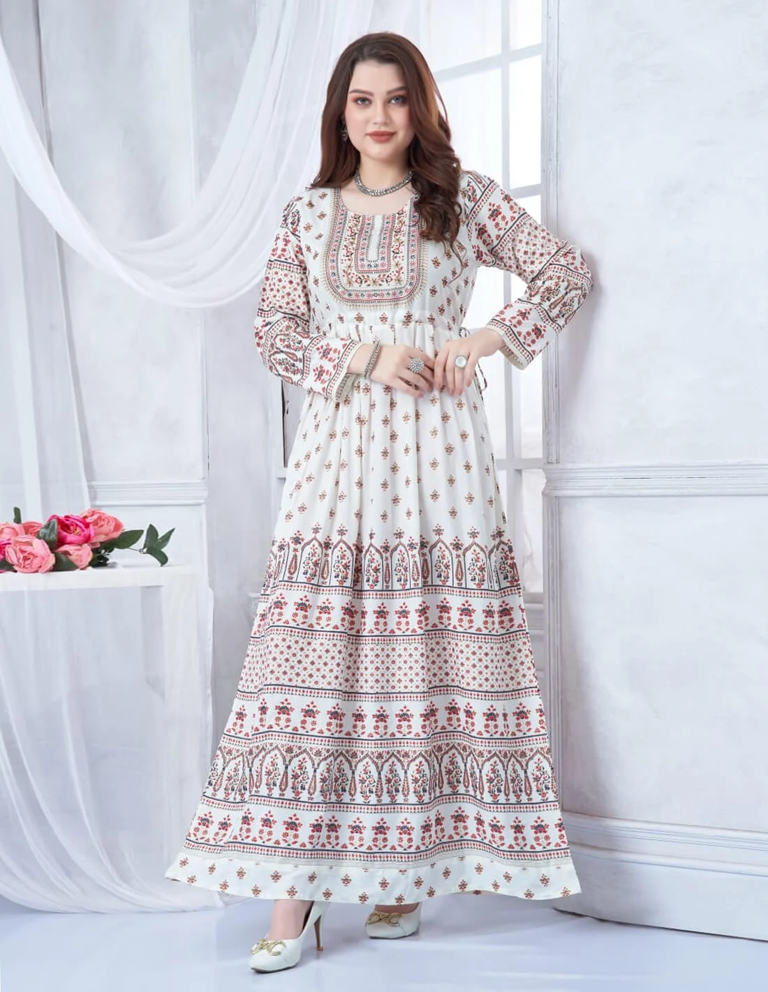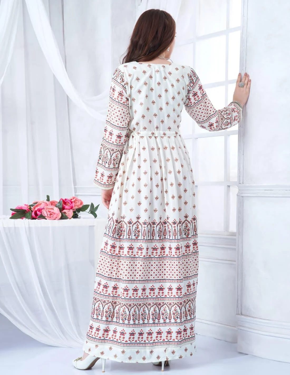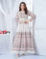 جلابية كم طويل كلوش بالاسفل طباعة مشجر مع تطريز خياطة بالصدر اللون أبيض