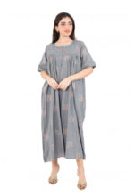 يتميز التصميم بقصة فضفاضة ومنسدلة تجعله مثالياً للأوقات العائلية أو الاسترخاء في المنزل، مع ياقة دائرية مزينة بتطريزات رقيقة وفصوص لامعة تتركز عند الصدر لتضفي لمسة من الأنوثة الجذابة.