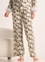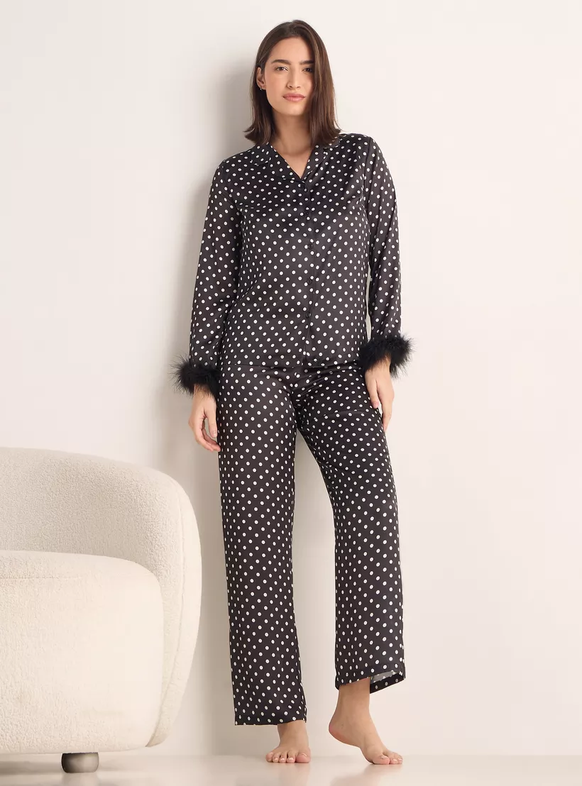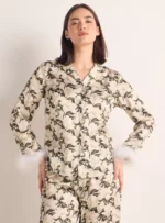 إضافة أنيقة إلى ملابسكِ المنزلية، طقم أنيق مكون من قميص بياقة مدببة وأكمام طويلة مزينة بأساور فرو، وبنطلون بيجاما، ويتميز بطابع عصري وشكل جميل بطبعات رقيقة، ومصنوع من خامة عالية الجودة لضمان ارتداء مريح طوال اليوم.